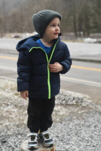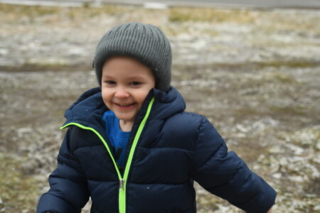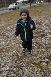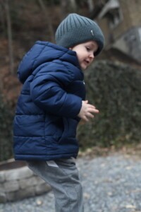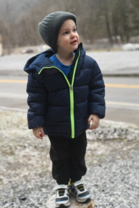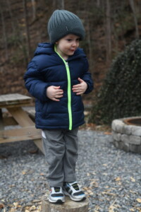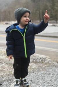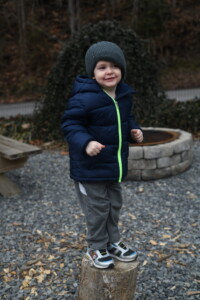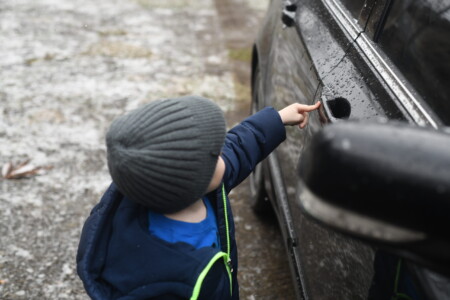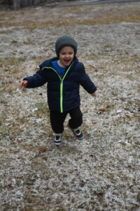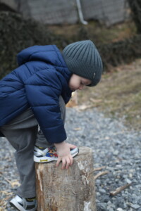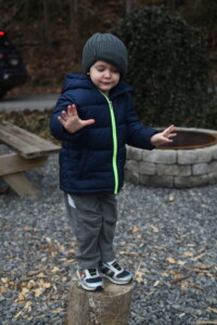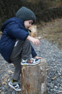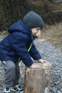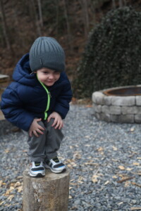 He also likes to get up on the wood-cutting stump on the gravel area and jump down, or clamber over and jump from the picnic table. And he locks the car by pressing the button. I couldn’t get pictures of him actually jumping, since he still likes me to at least hold one hand or catch him with both hands.